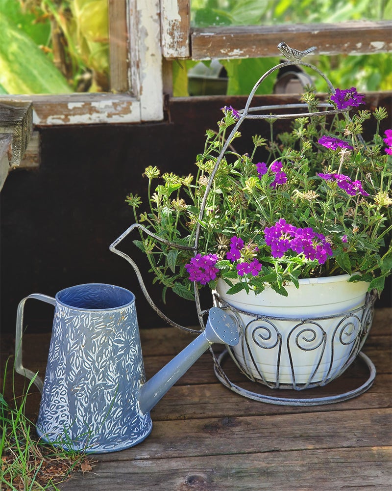 Teekannun muotoinen harmaa kasviteline, jonka päällä istuu pieni lintu. Romanttinen kukkateline on kaunis yksityiskohta puutarhassa, kuistilla ja terassilla!