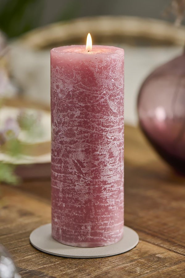 Pöytäkynttilä punertavassa malvan sävyssä. Kynttilöissä on kauniin rustiikkinen pinta.