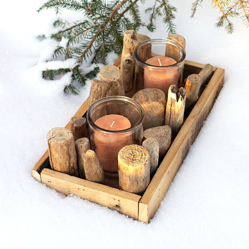 Ajopuusta valmistettu kynttiläteline tuo ihanan rustiikkista ja luonnonläheistä tunnelmaa illallispöydän kattaukseen tai olohuoneen sohvapöydälle!