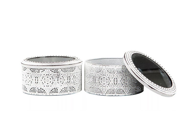 Boheemilla kuviolla koristeltu valkoinen metallirasia, jonka kannessa on pyöreä peili. Kaunis ratkaisu esimerkiksi korujen tai kosmetiikan säilyttämiseen!