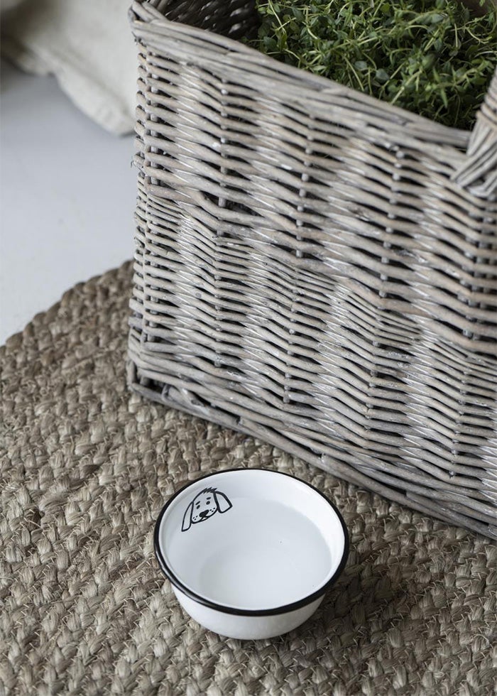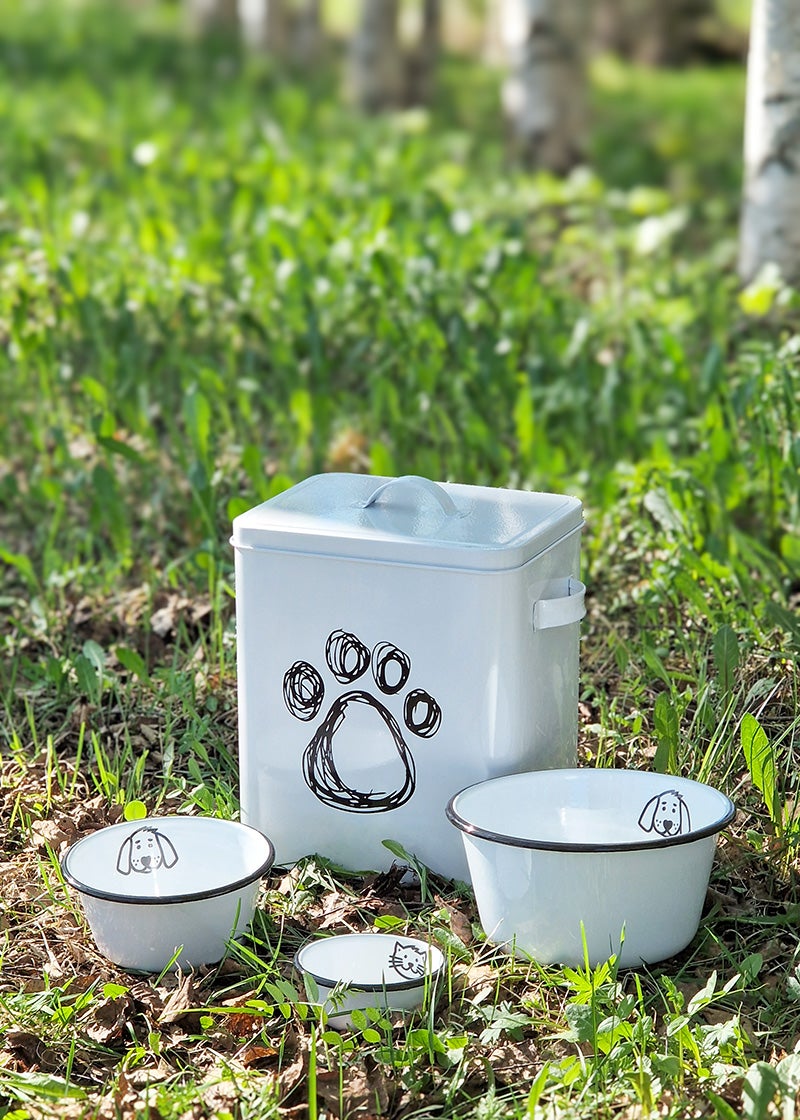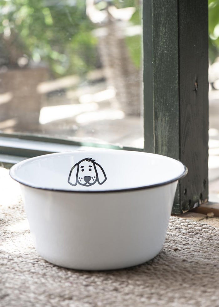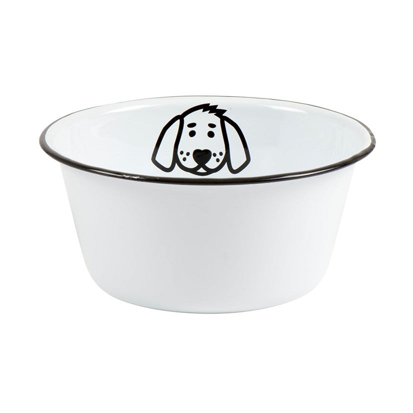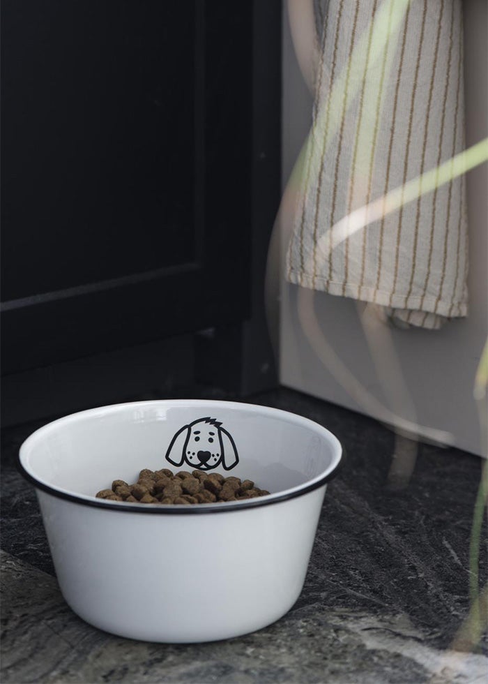 Emalinen kuppi on tyylikäs ja klassinen valinta koiran ruoka-ja juoma-astiaksi. Valkoisessa kulhossa on musta reunus ja suloinen koirakuvio.