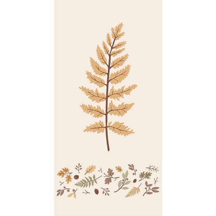 Paperisissa lautasliinoissa on vaalealla pohjalla oranssi saniainen sekä syksyinen lehtireunus. Ihana yksityiskohta keittiössä ja syksyisissä kattauksissa!