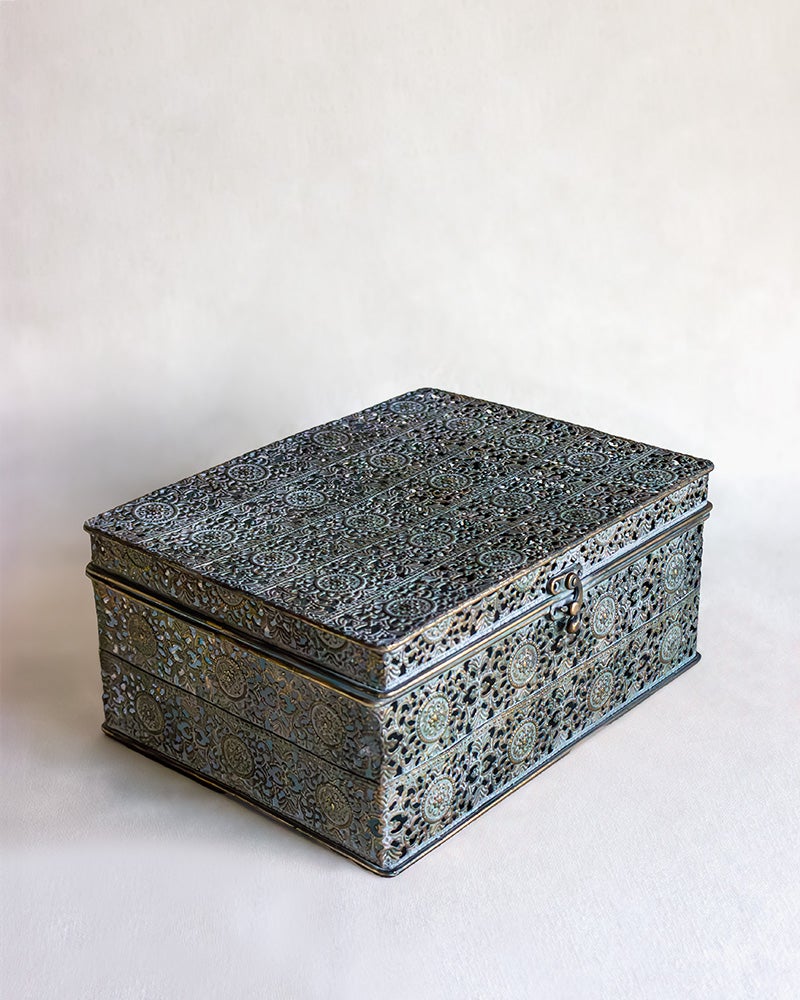 Kullanruskeassa metallisessa laatikossa on kauniisti patinoitunut ornamenttikuvioitu pinta. Monipuolinen ja katseenkestävä ratkaisu kodin piensäilytykseen!